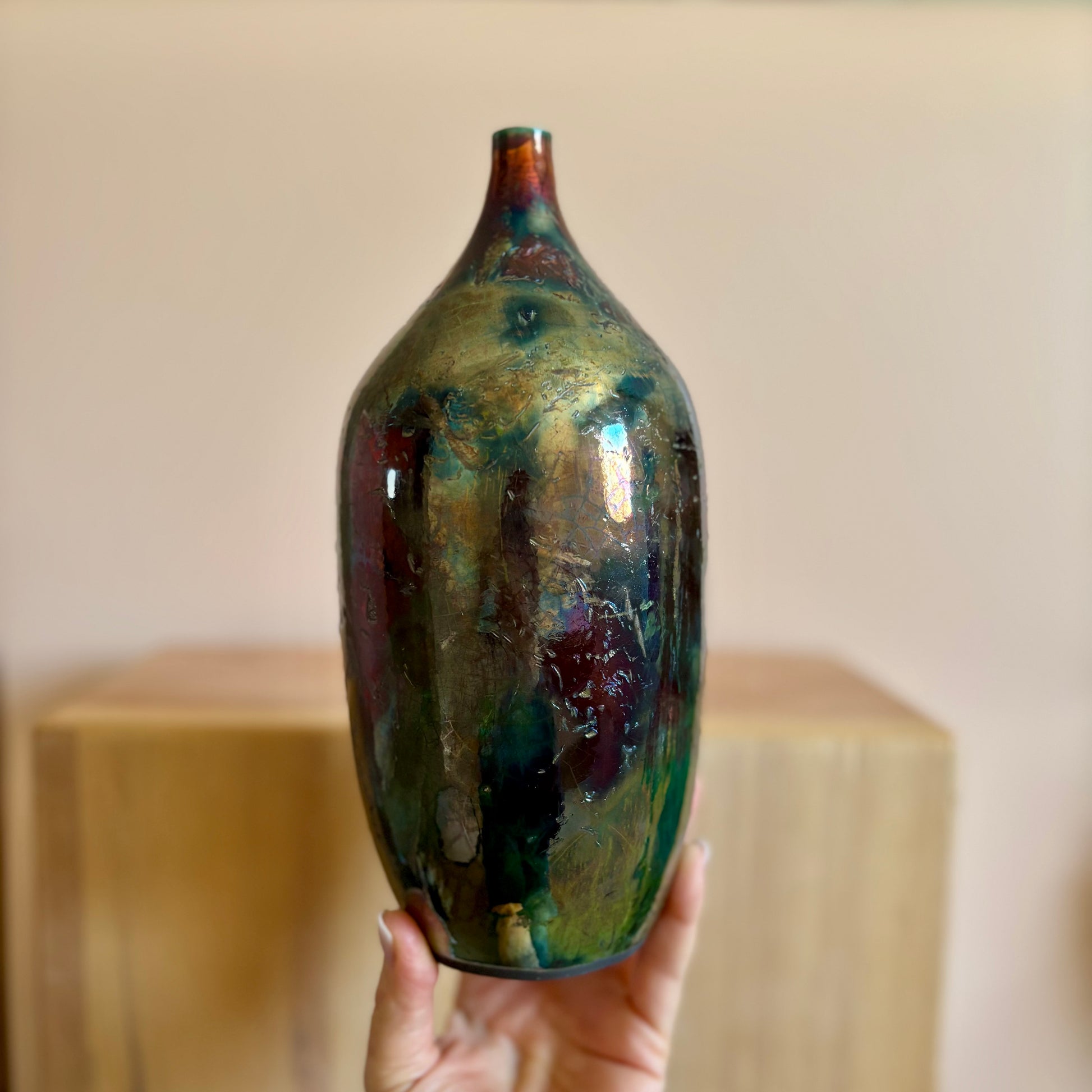 Decorative porcelain, raku-fired iridescent vase. Dry flowers only.