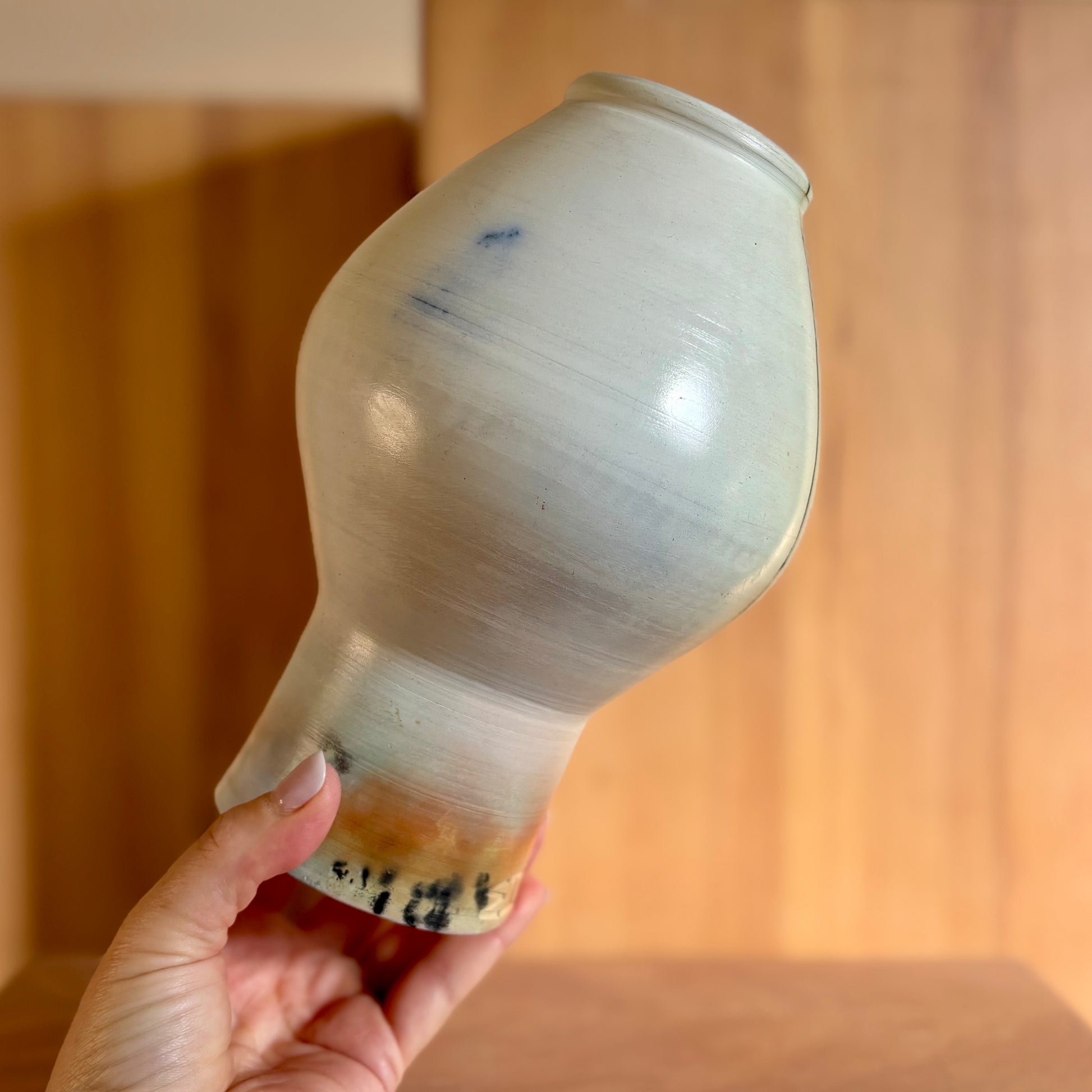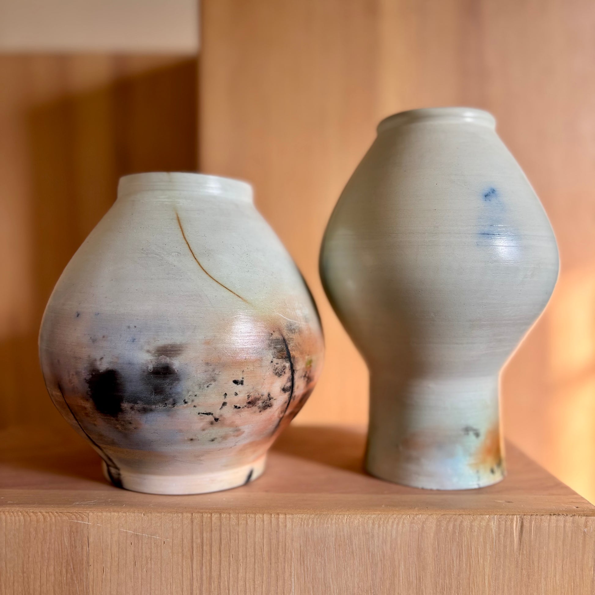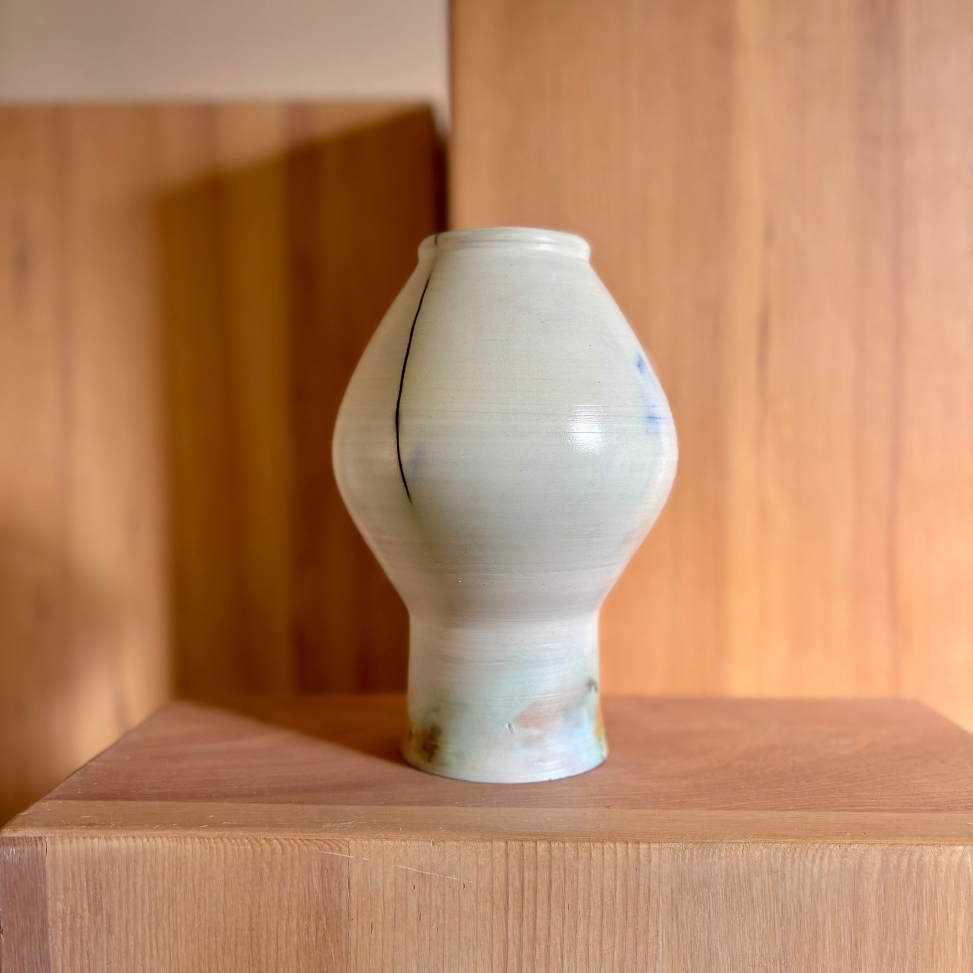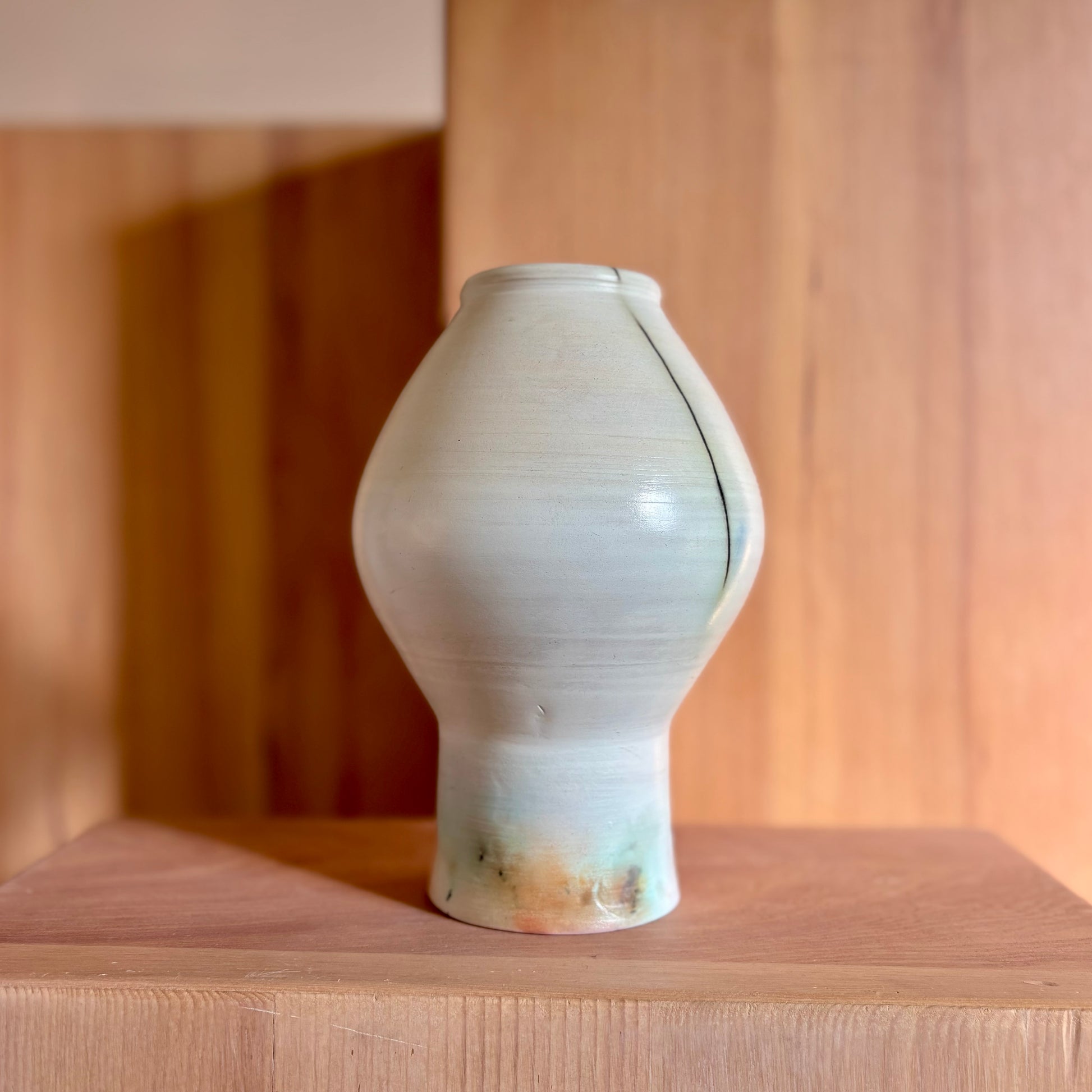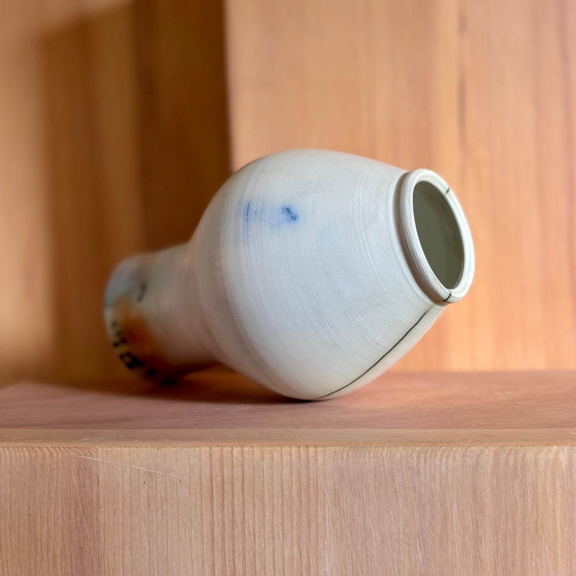 Decorative porcelain, saggar-fired elevated moon jar. Dry flowers only.