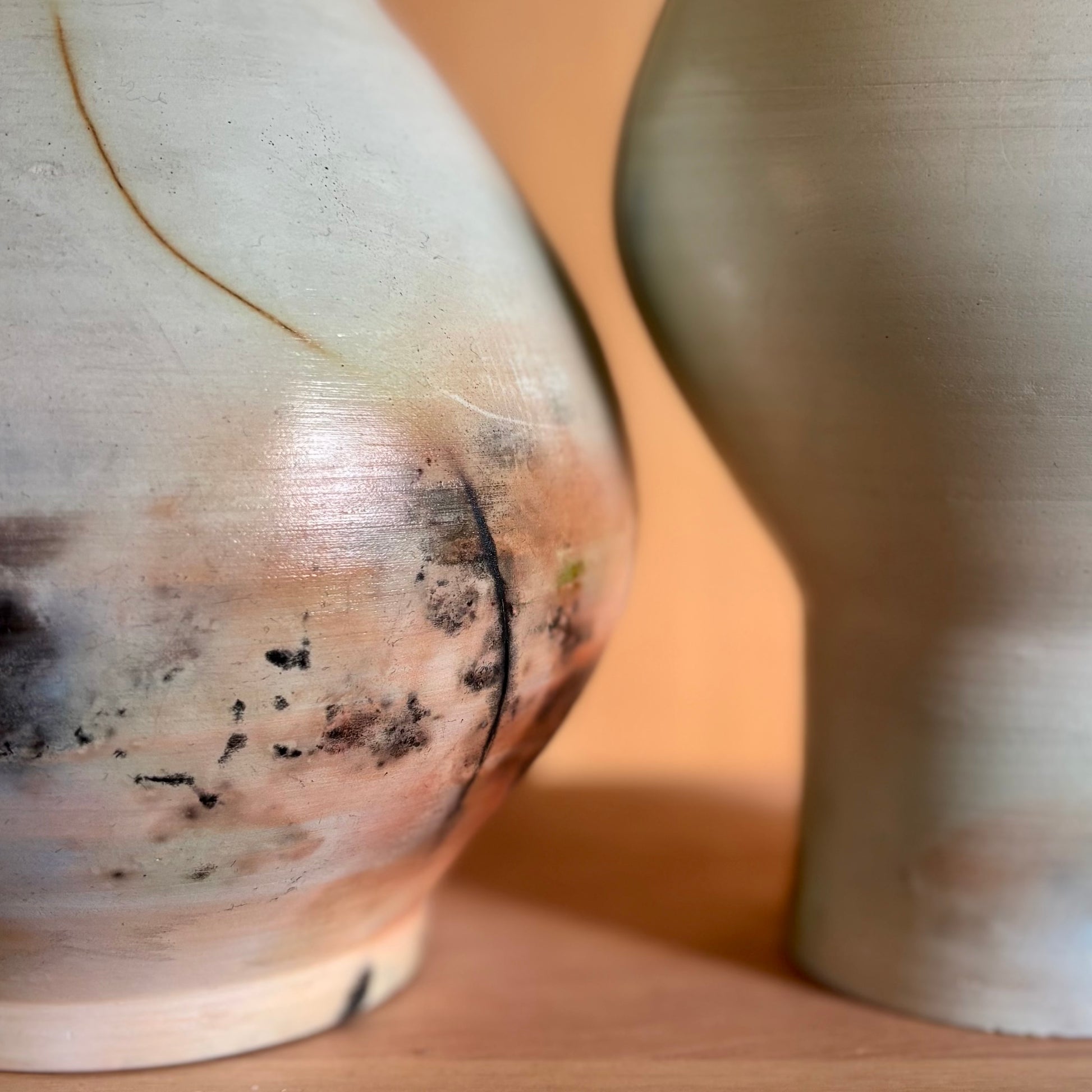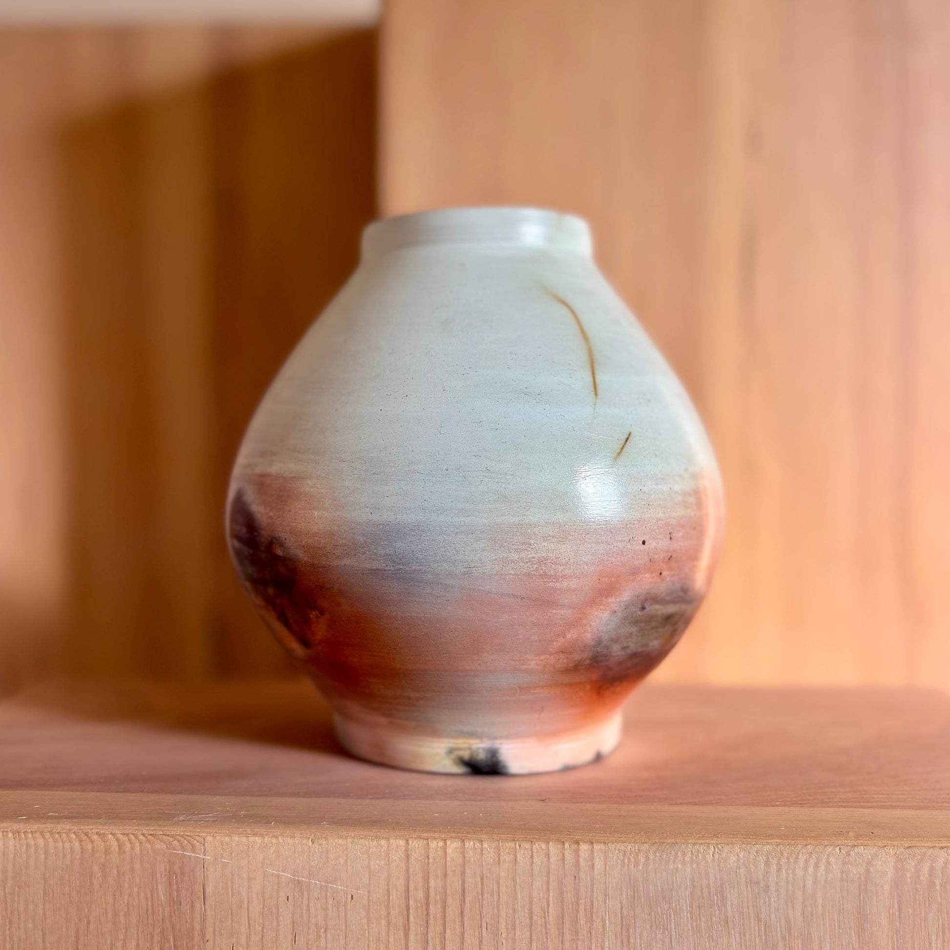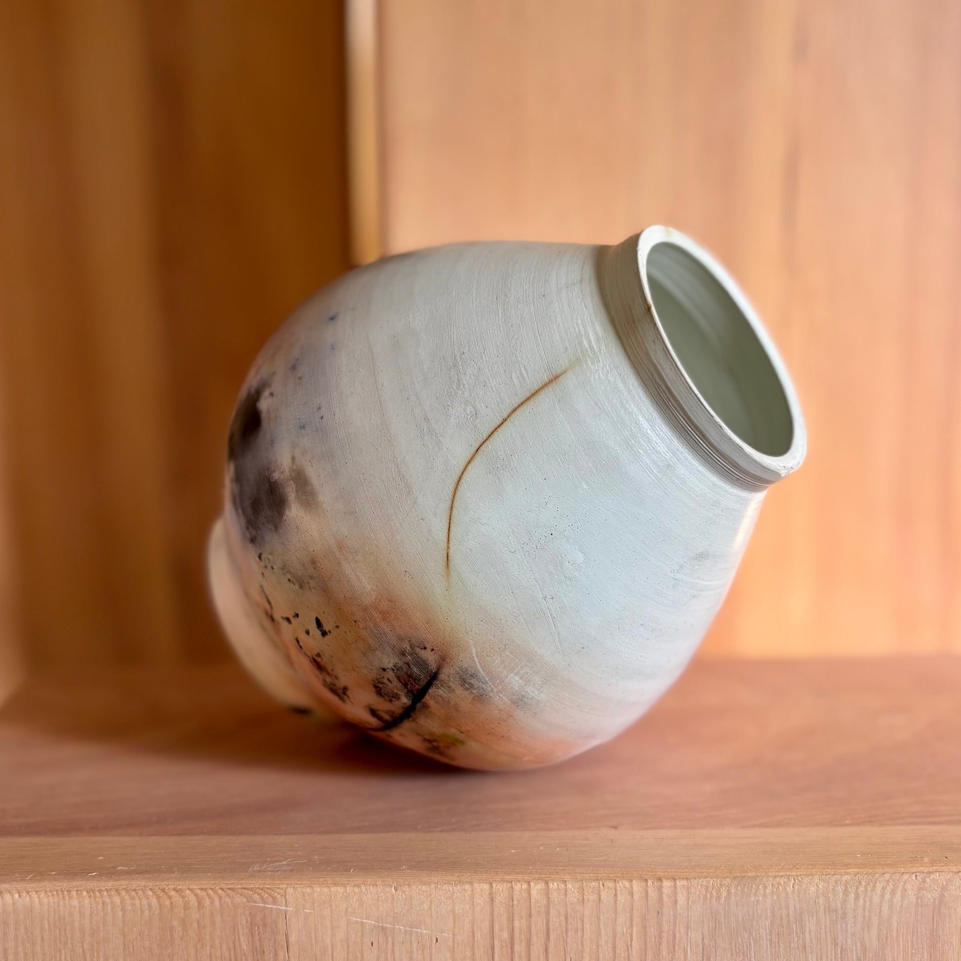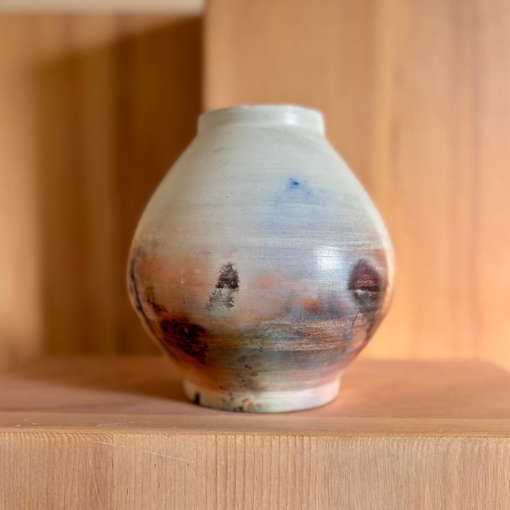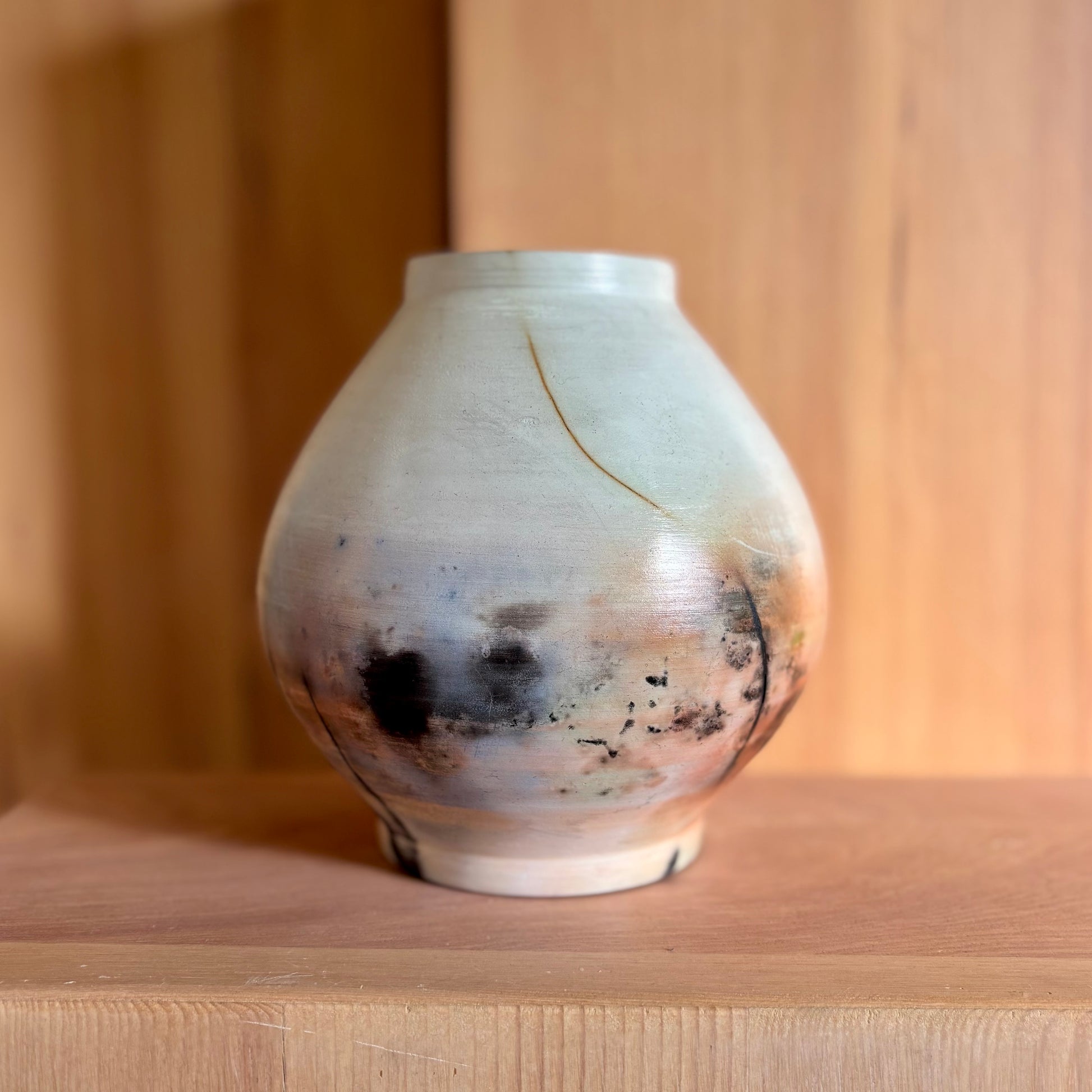 Decorative porcelain, saggar-fired moon jar. Dry flowers only.