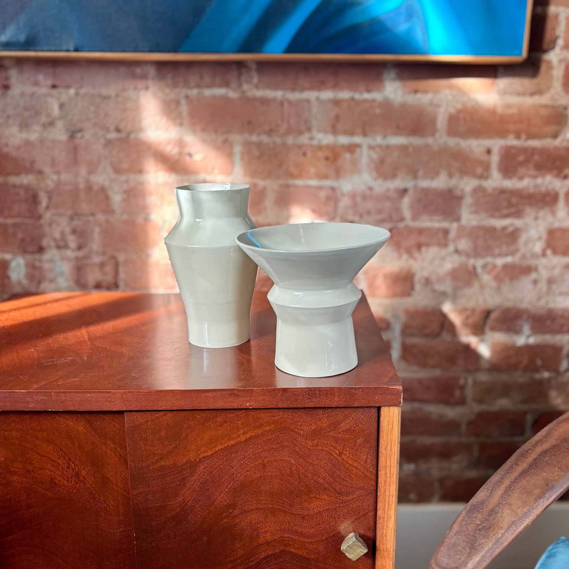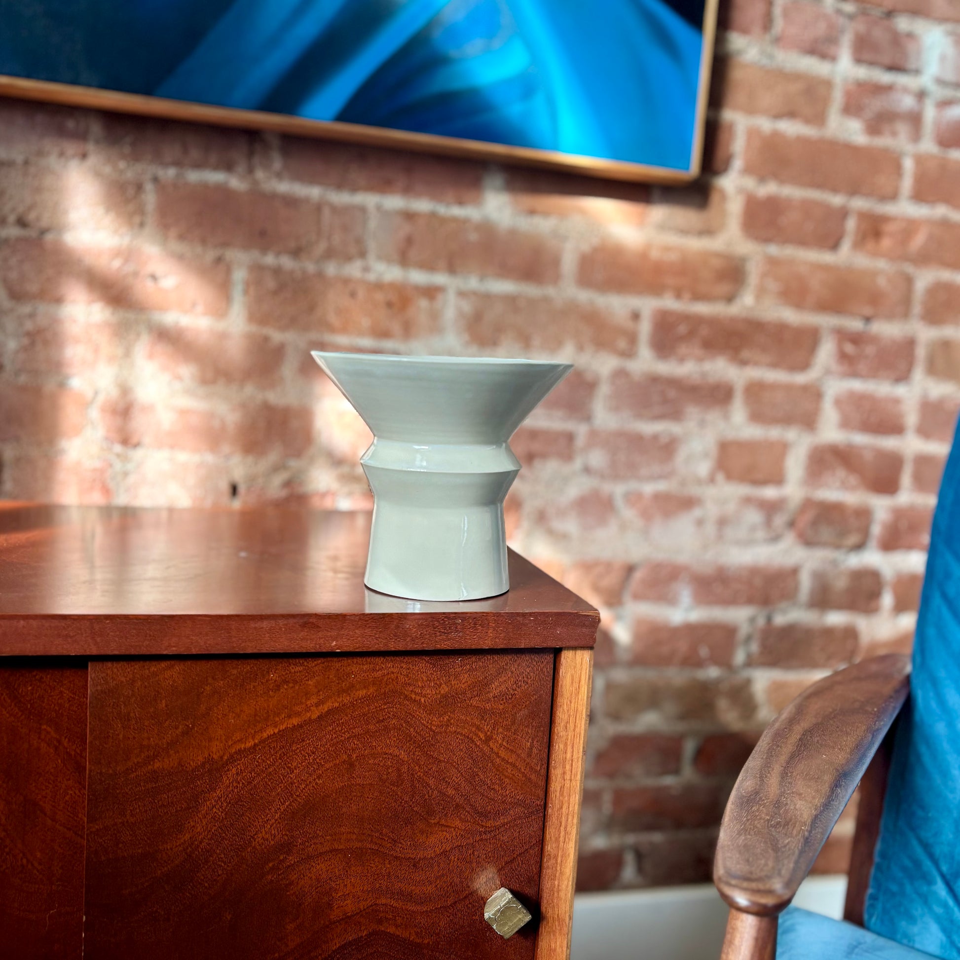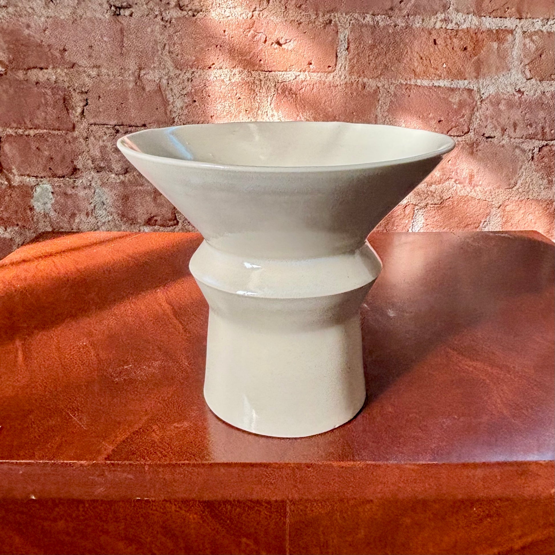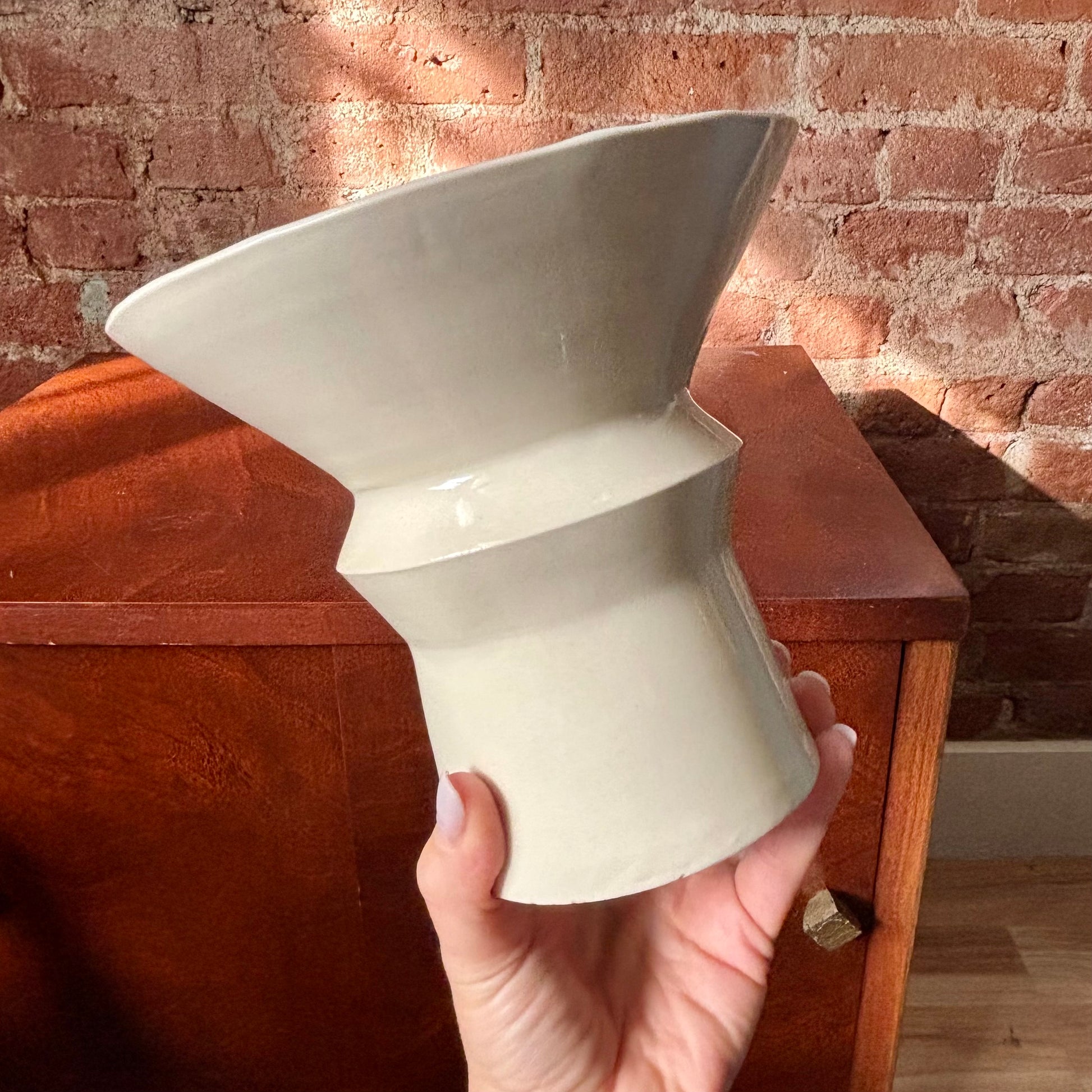 Porcelain angular vase finished with a clear, slick, glaze. The wide opening at the top makes this perfect for an ikebana-style flower arrangement. Made for dry or fresh flowers.