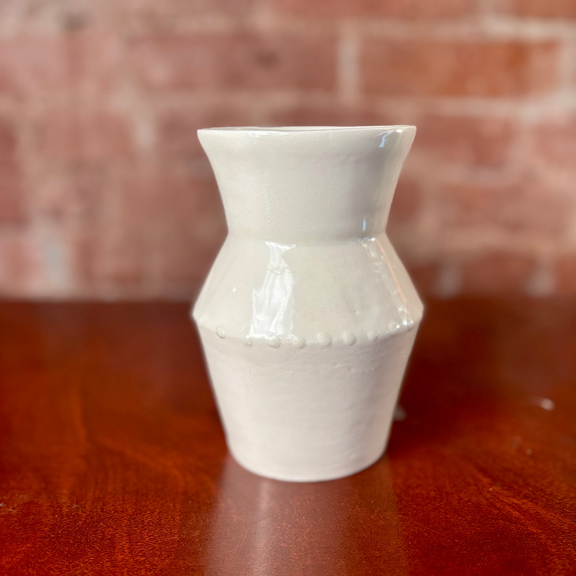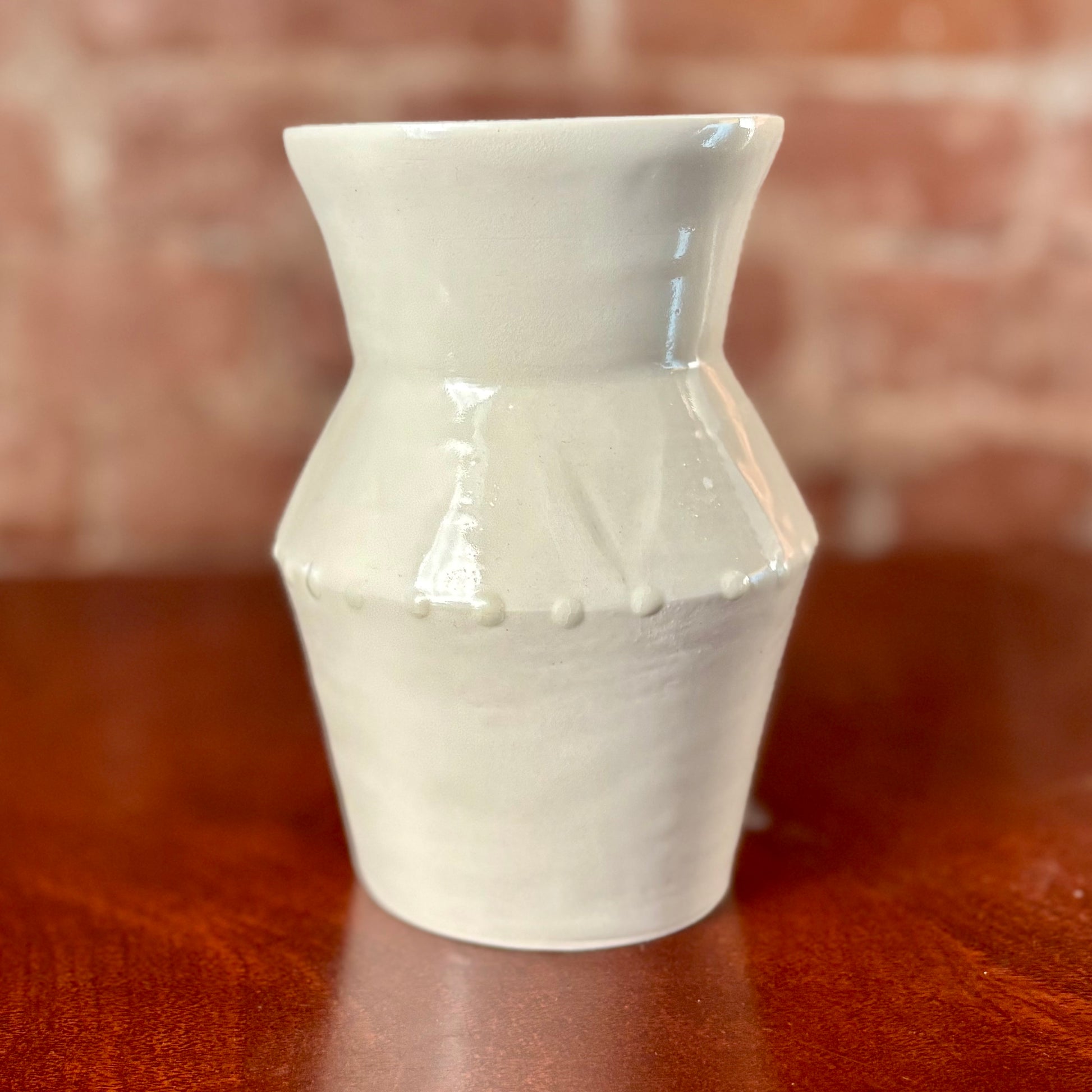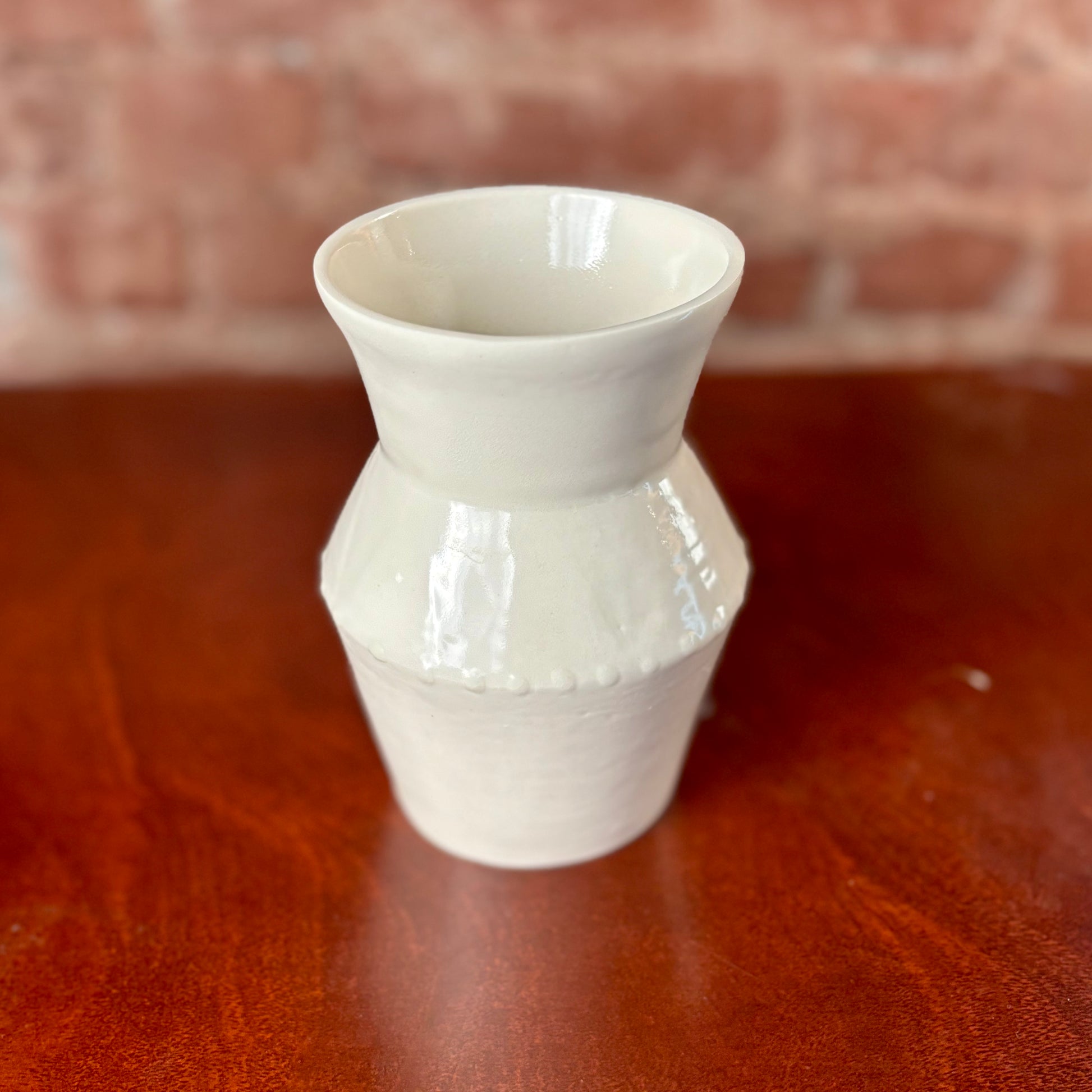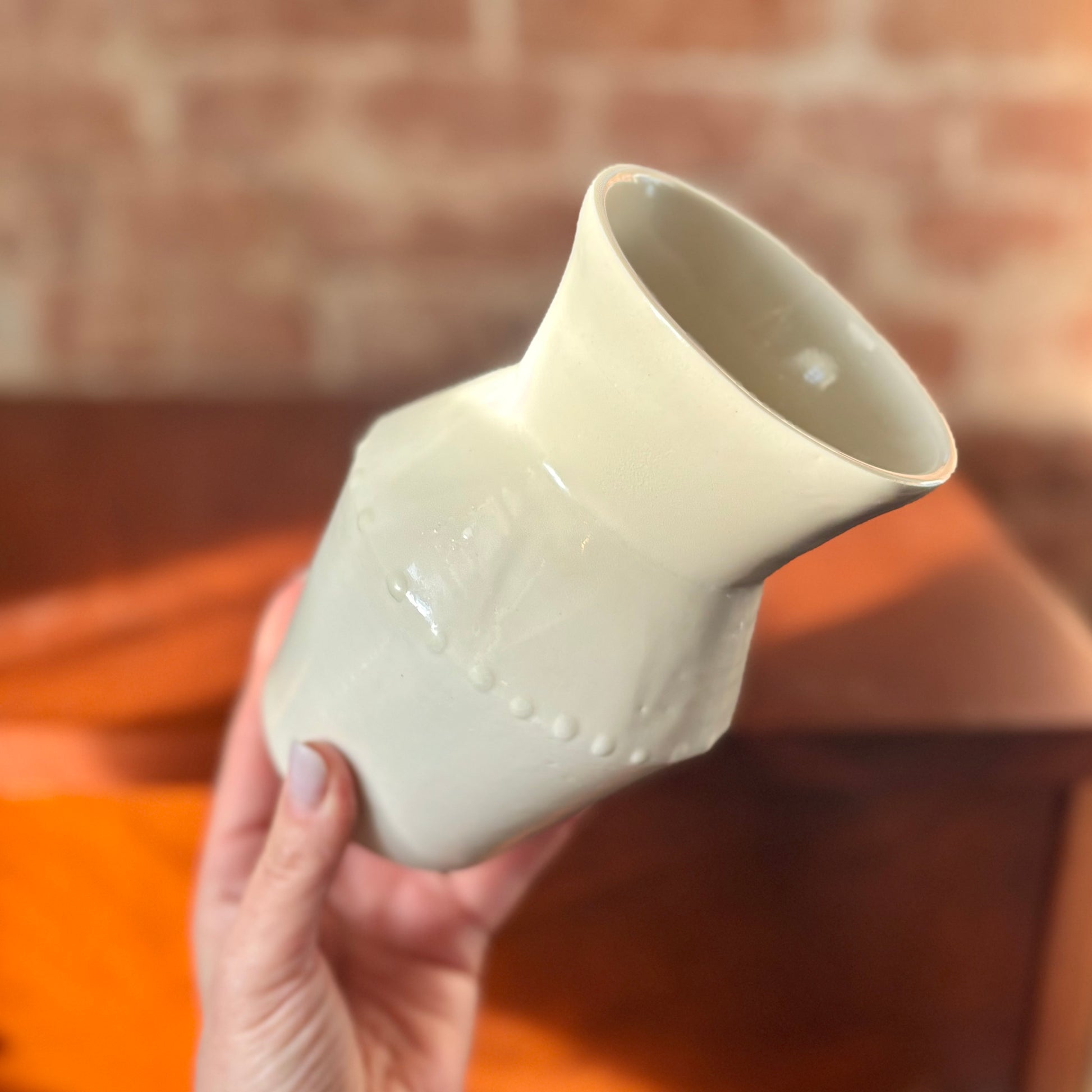 Porcelain angular vase subtly etched with a gloopy white glaze finish. Made for dry or fresh flowers.