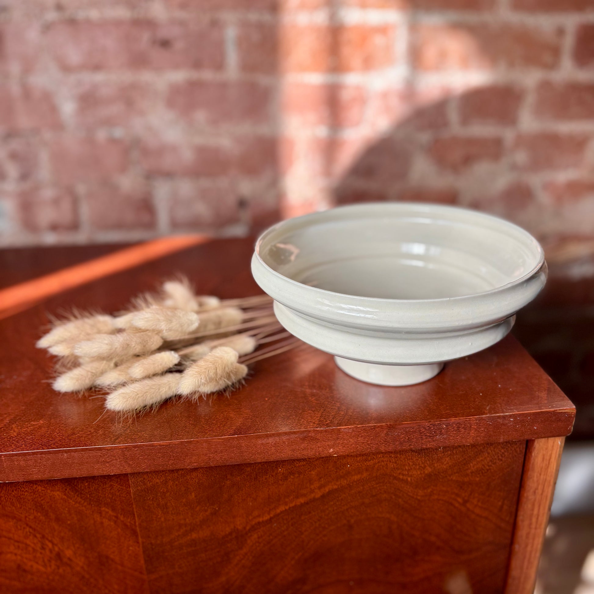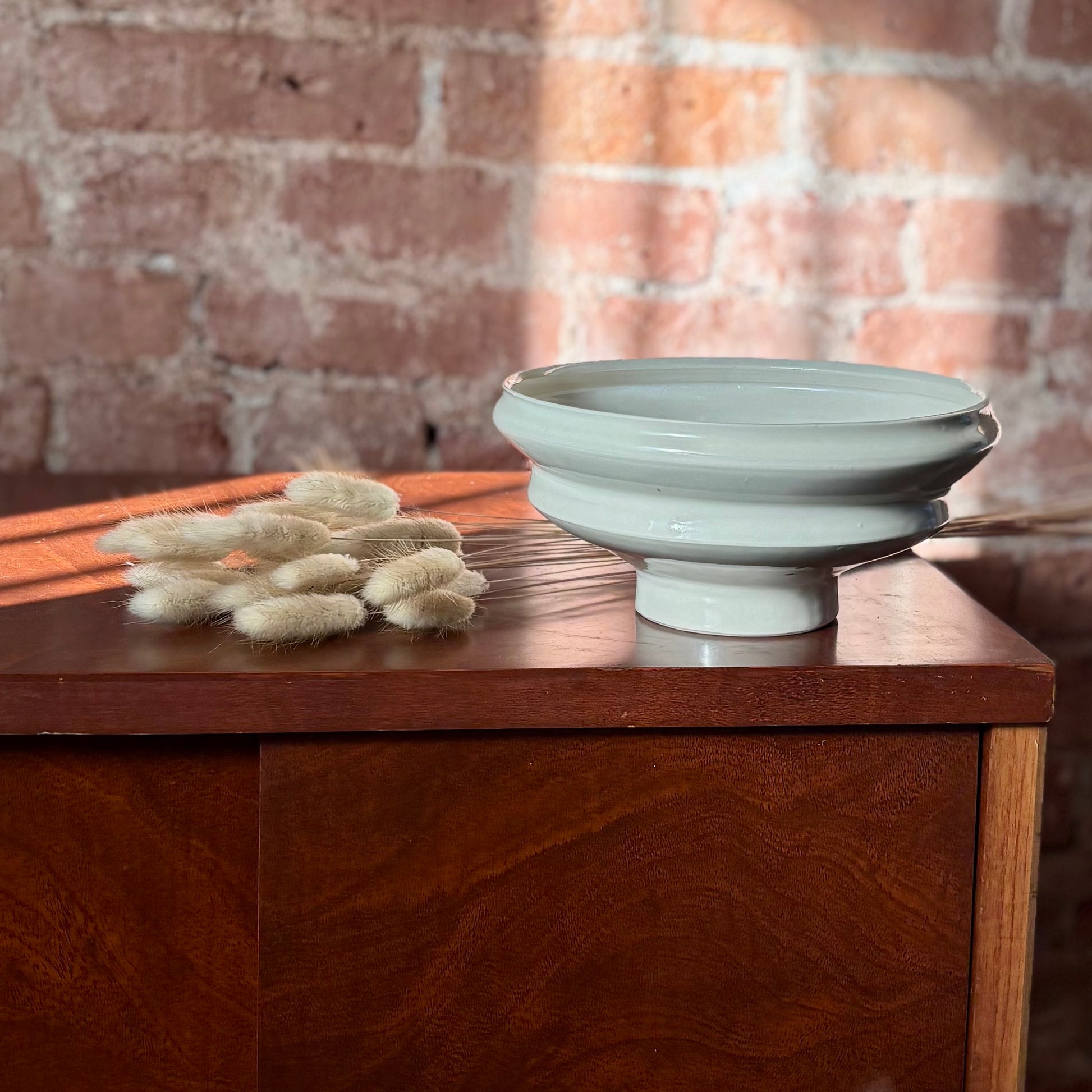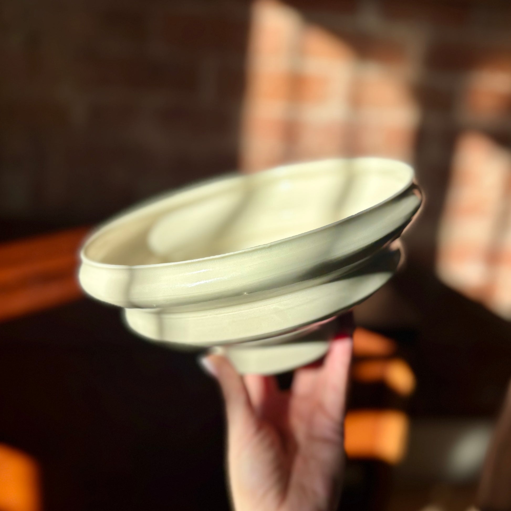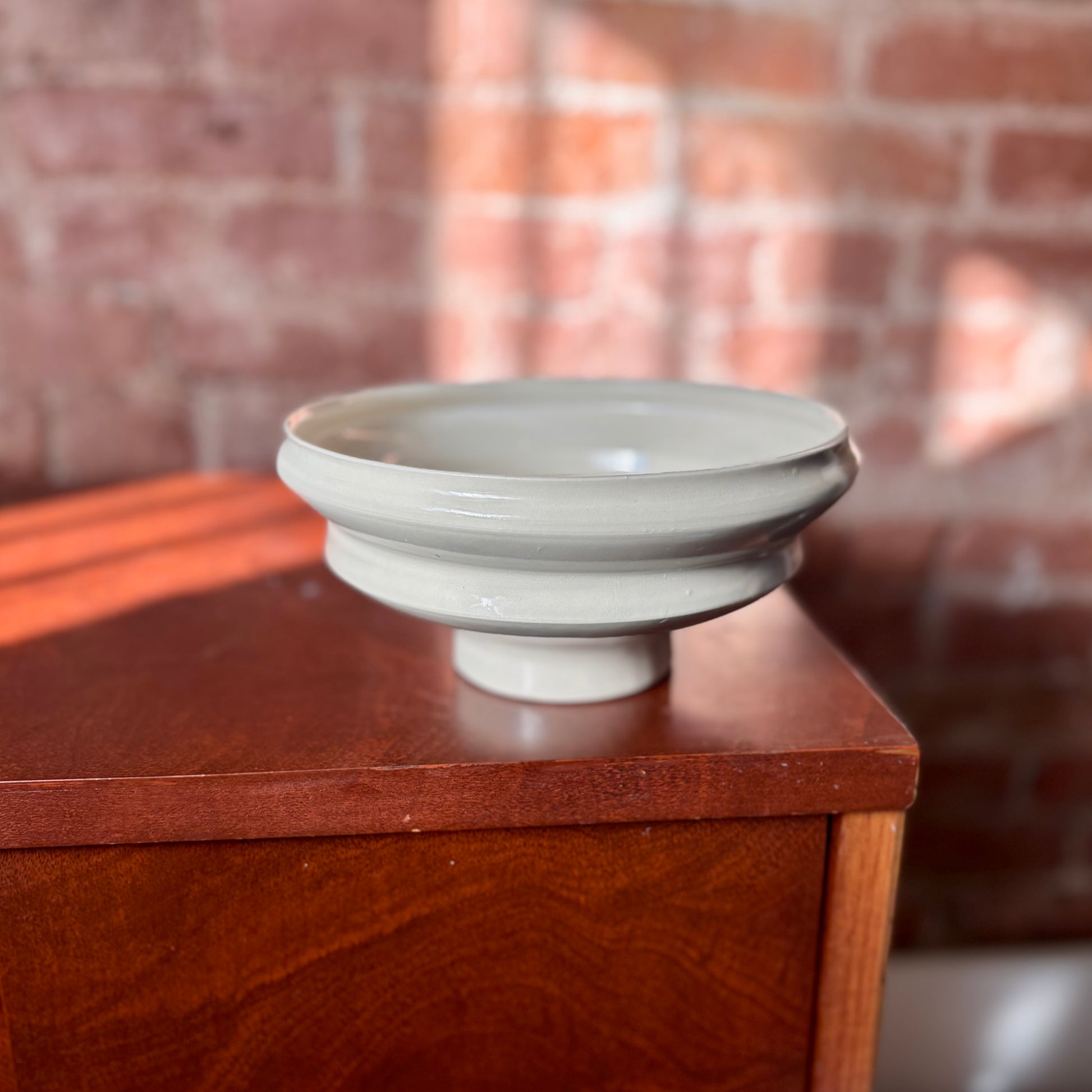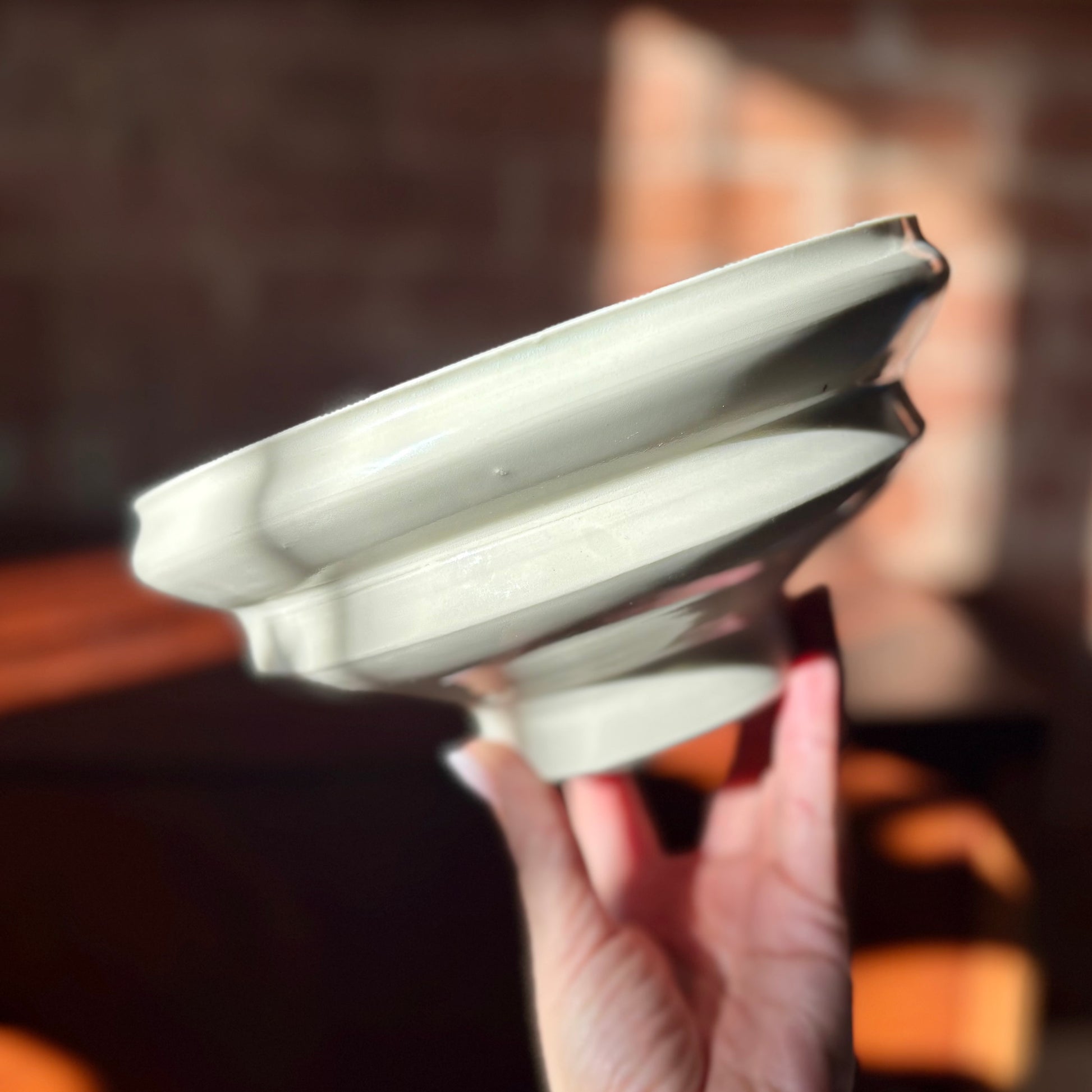 Porcelain angular bowl with a narrow foot finished with a clear, slick, glaze. This bowl can be decorative as it is or as an ikebana vessel used with a flower frog. This porcelain bowl can also serve as a functional piece and it's food-safe.D